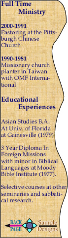 A zeal to finish Christ's commission in my lifetime has shaped my life. By serving overseas in Taiwan with OMF International in the 80s in cooperation with the national church doing church planting and pasto- ral work at the Pittsburgh Chinese Church in the 90s, my vision has become more complete of what God is doing around the world. |
